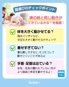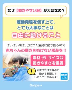 実は、服の選び方ひとつで赤ちゃんの「動きやすさ」が大きく変わることもあります。
